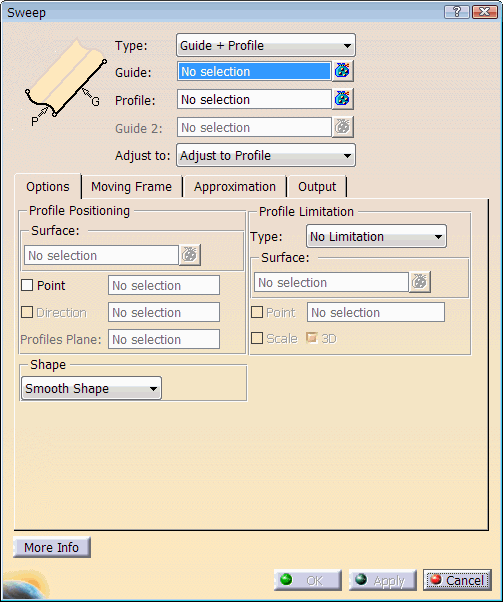 - Form (nur in ISD): Vorgabe der Form der Fläche, d. h. Art des Übergangs zwischen den einzelnen angewählten Profilen.