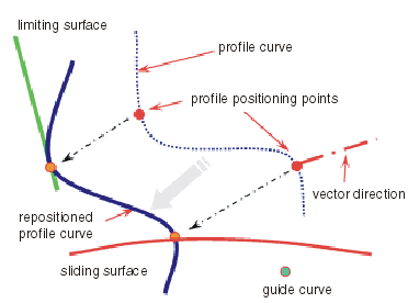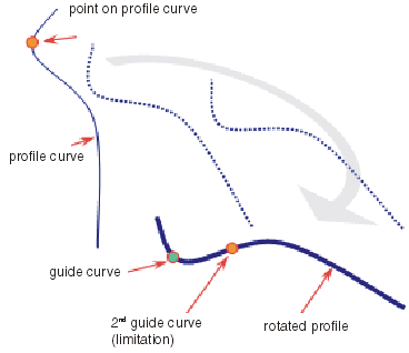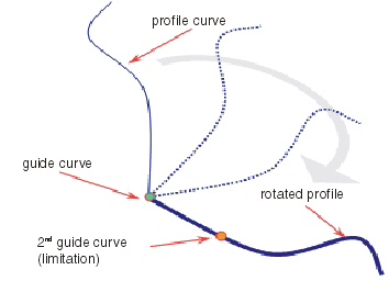 Zunächst wird ein Profil entsprechend dem Profilpositionierungspunkt auf der Führungskurve positioniert. Dann wird es um die Führungskurve gedreht, bis es durch das Berühren einer 2. Führungskurve begrenzt wird.