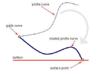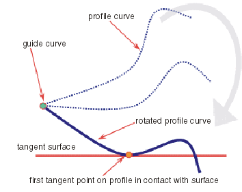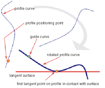 Ein Profil wird zuerst entsprechend dem auf dem Profil ausgewählten Punkt auf der Führungskurve positioniert. Dann wird es um die Führungskurve gedreht, bis der erste Tangentenpunkt auf dem Profil eine ausgewählte Tangentenfläche berührt.
