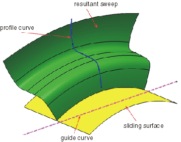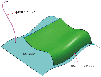 - Flächen: Das Profil wird auf einer Verschiebungsfläche positioniert, wenn eine Translation entlang der Führungskurve erfolgt.