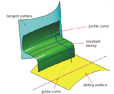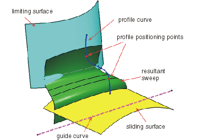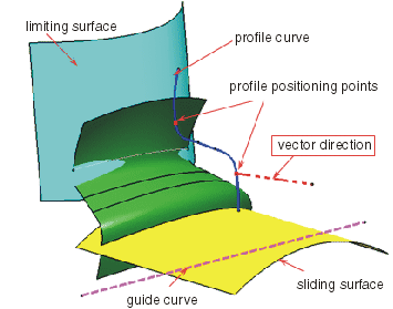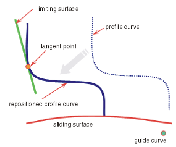 Ein Profil wird auf einer Verschiebungsfläche positioniert, wenn eine Translation entlang der Führungskurve erfolgt, bis ein Tangentenpunkt auf der Profilkurve die ausgewählte Fläche berührt, die zur Begrenzung verwendet wird.